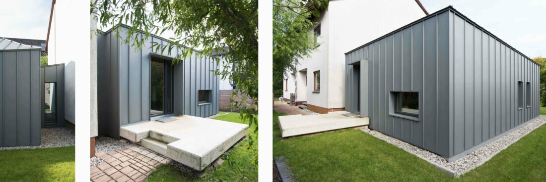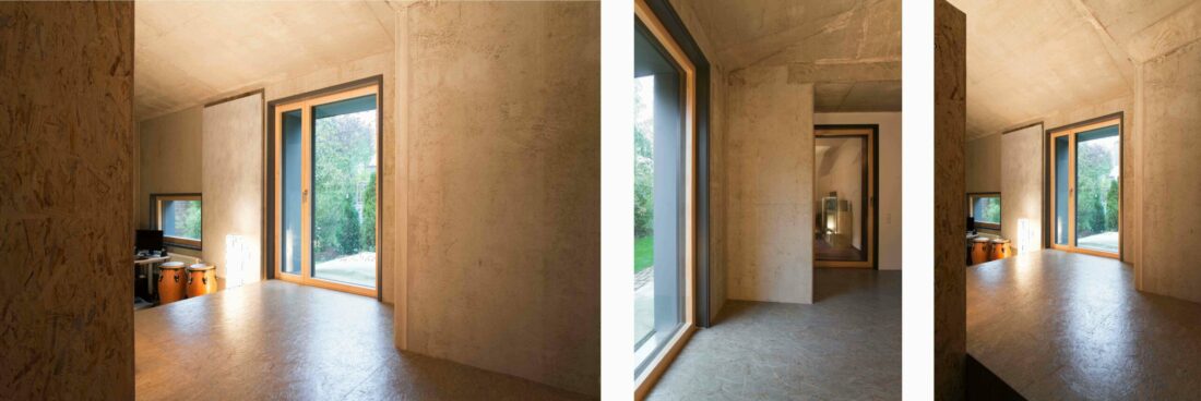 … Ziel musste es daher sein, mitten in einem Wohngebiet ohne direkten Grundstückszugang ein Bauwerk zu errichten, in dem es möglich ist, in Bandbesetzung musikalische Proben und Aufnahmen mit Tageslichtbezug durchführen zu können, ohne die nachbarschaftlichen Verhältnisse zu strapazieren.